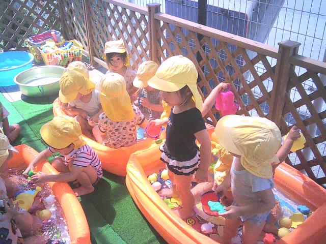 ぞうさんのじょうろや金魚さんやあひるさんの水用玩具を使って、楽しく遊んでいます。