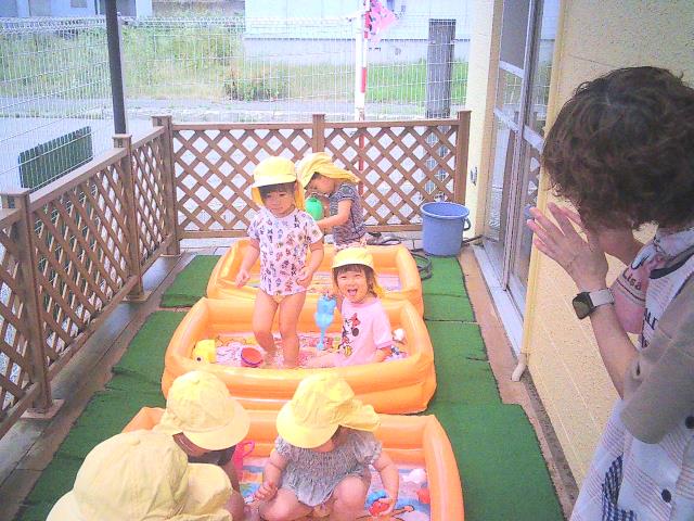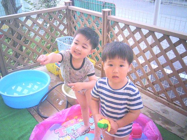 お友だち同士で水をかけあったり、先生達の足にかけたりして楽しんでいましたよ!!