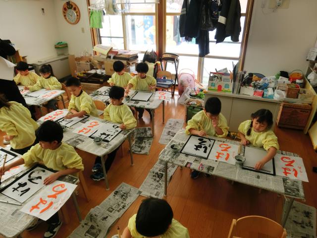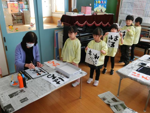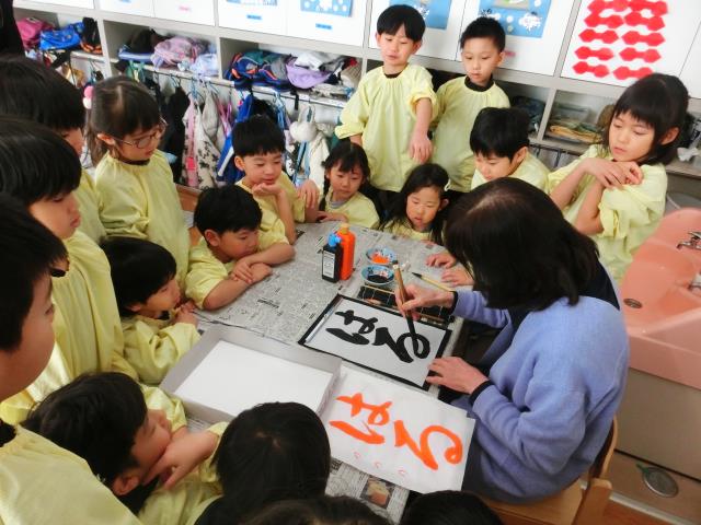 習字の先生と小学校でも上手に字が書けるよう、頑張る約束をした子ども達です。