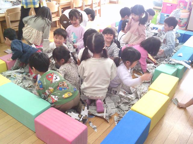 最後は新聞紙をビリビリちぎり新聞プールを楽しんでいます。