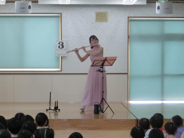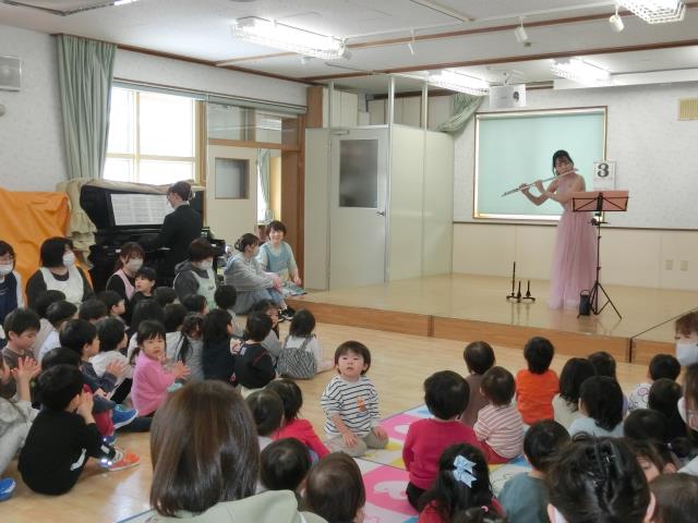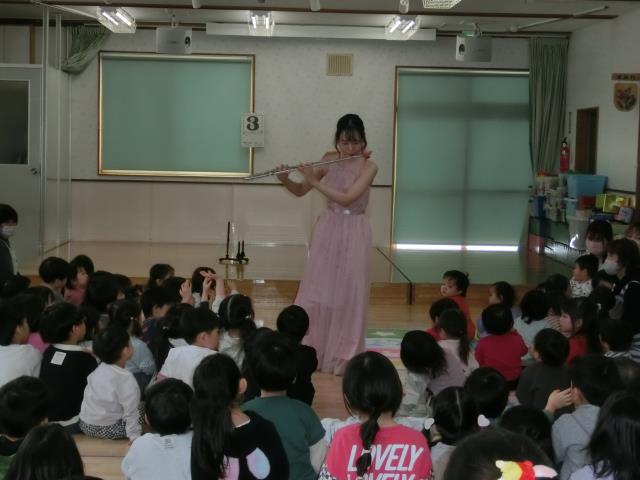 子ども達の聞きなじみのある「アンパンマンマーチ」や「さんぽ」「小さな世界」「ぼよよ~ん行進曲」などを演奏して下さり、体を動かしながら一緒に歌ったり聞き入っていた子ども達でした。