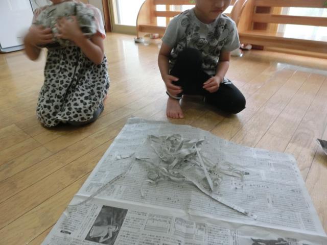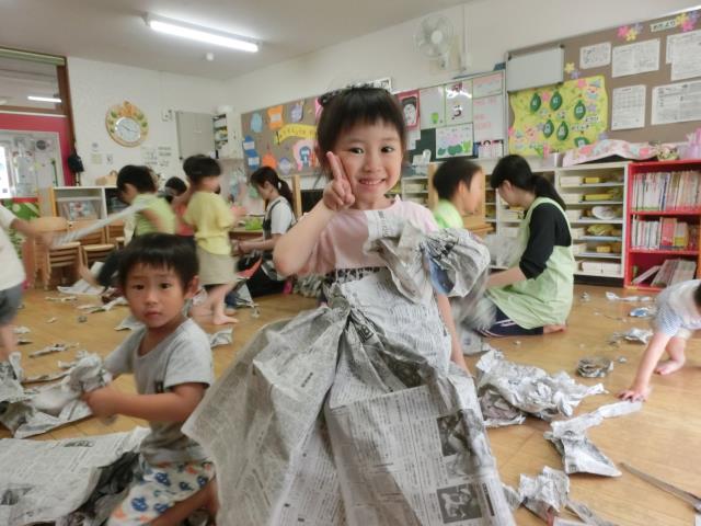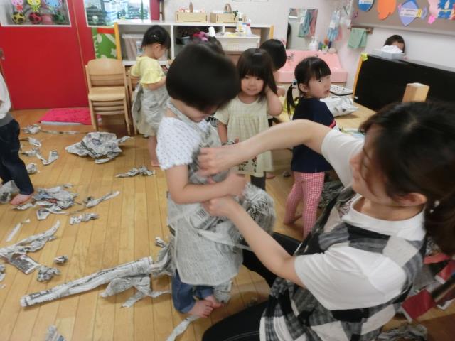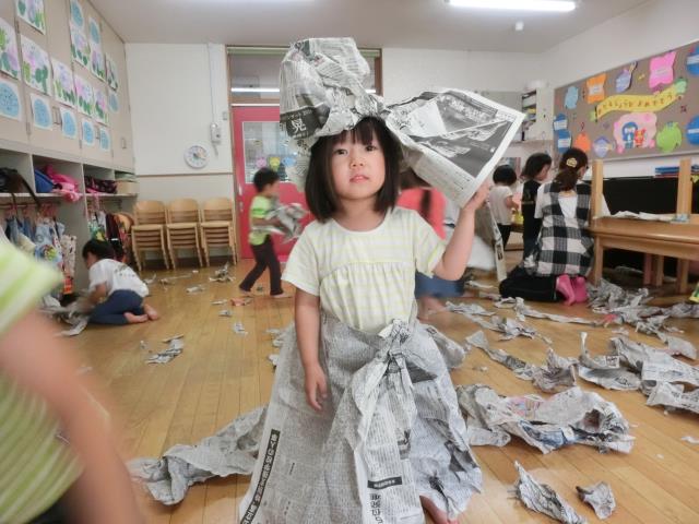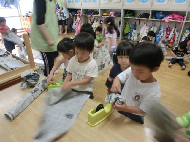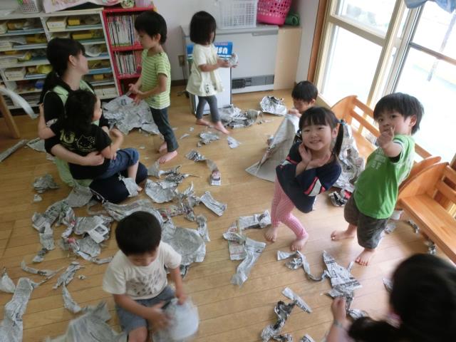 雨降りの今日 ちゅうりっぷ組さんは、‟新聞紙”で遊んでみました。