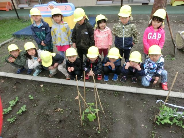 さくら組さんが先日植えた‟枝豆”と‟きゅうりの苗”4本の内、きゅうり3本が寒さで枯れてしまいました。