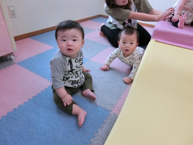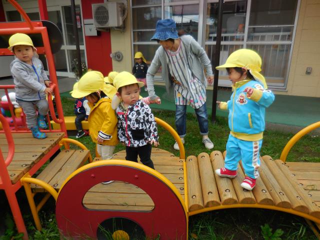 つくし組さんは、初めて全員で玄関前の遊具で遊びました。