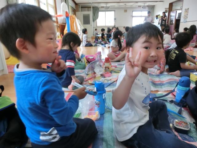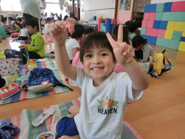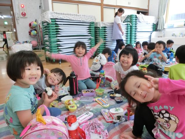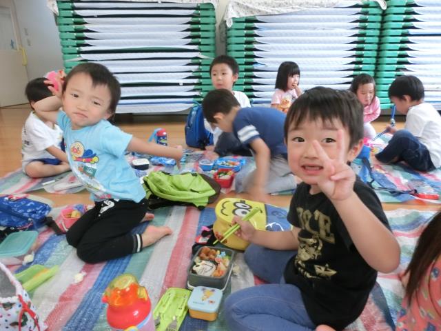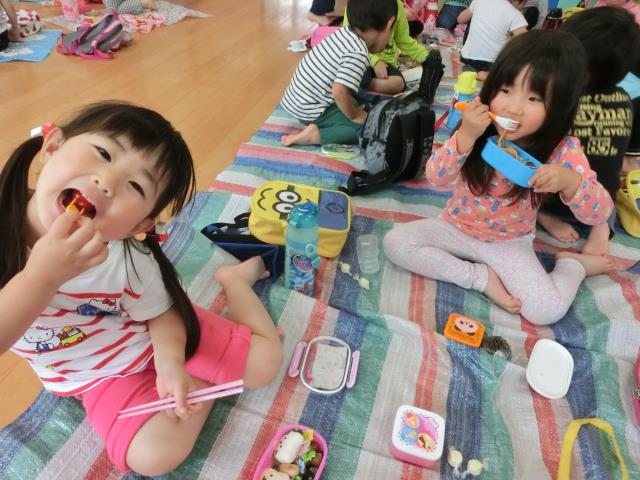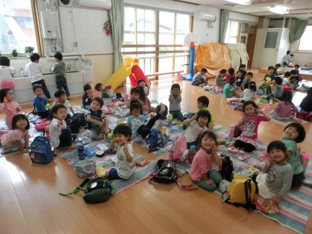 3歳~5歳クラスは ホールでお弁当を食べました。