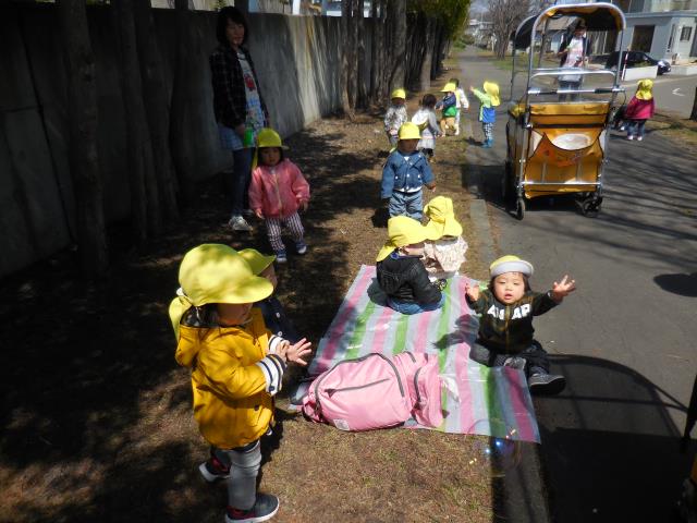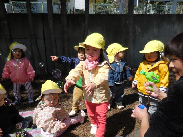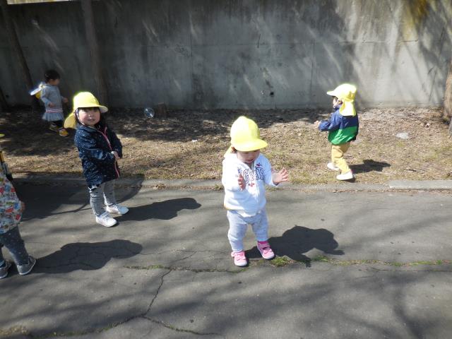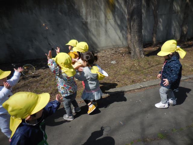 遊歩道で先生たちにシャボン玉をふくらませてもらい、それを追いかけて歩いたり走ったり。