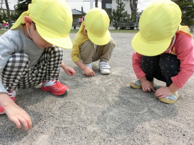 あっちへ走ったり、こっちへ走ったり、ちょっとしゃがんで土の上にお絵かきをしてみたりと、思い思いに楽しみました。