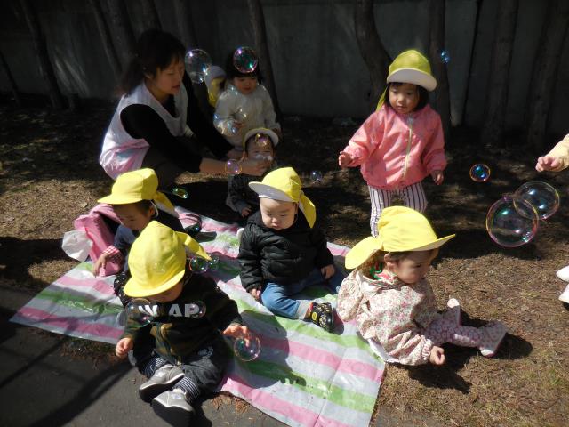 ふわりふわりと飛ぶシャボン玉を大喜びで追いかけていましたよ。