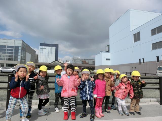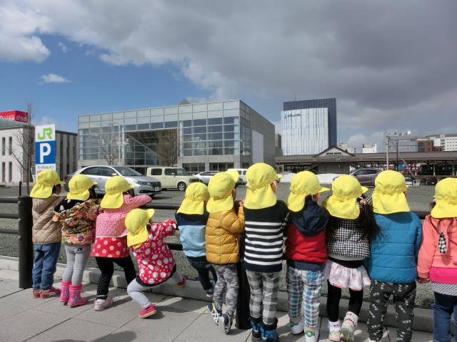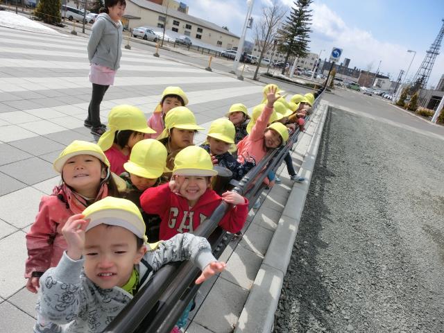 今日は、駅裏まで足をのばして汽車をみたり、木のプラザの前の遊具でちょっぴり遊んだり。