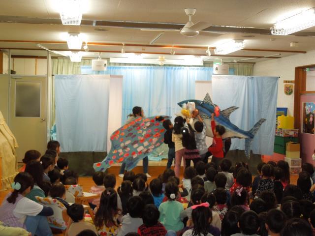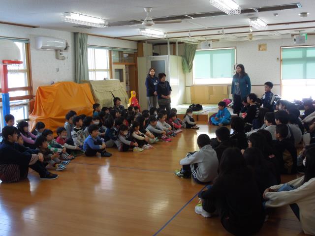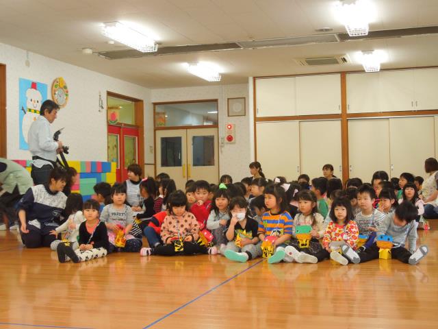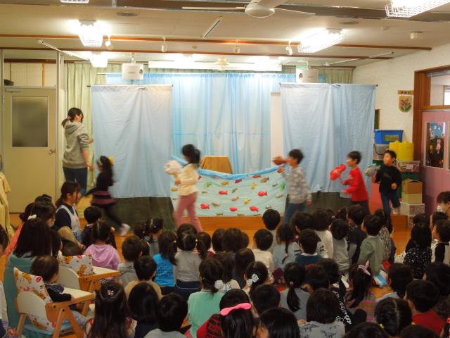 園長先生のお話を聞いて、歌をうたってから始めましたが、なぜか全体的にホールの後ろの方に ちんまりと座っていたみんな。