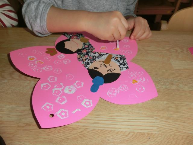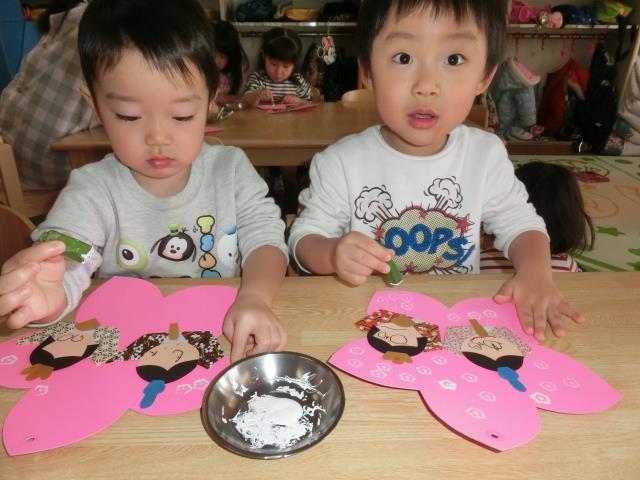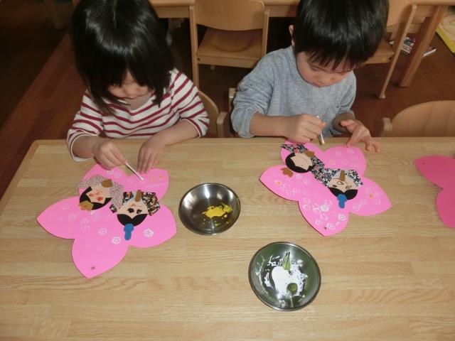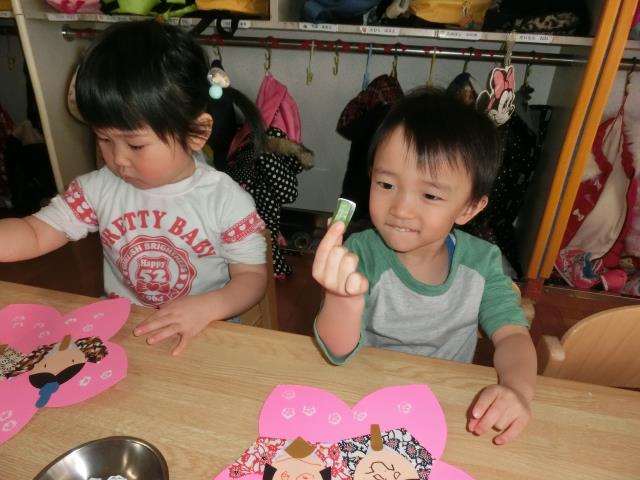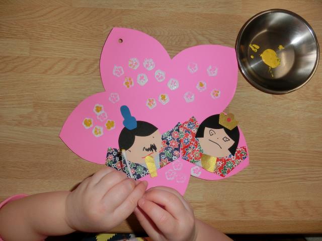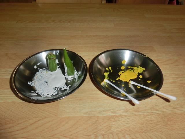 たんぽぽさんは、おひな様制作の仕上げに”オクラでスタンプ”をして、花を飾りました。