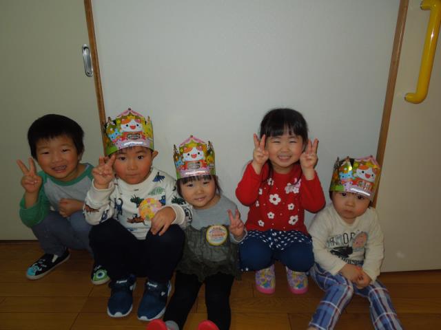 2歳児~5歳児はホールで集まって、豆まきをしました。