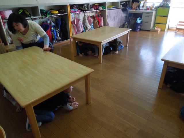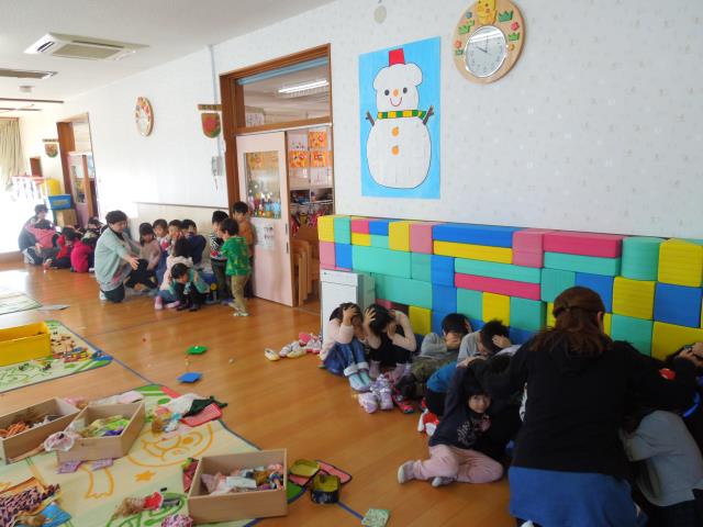 今日は、”自由あそび中の地震”の避難訓練をしました。