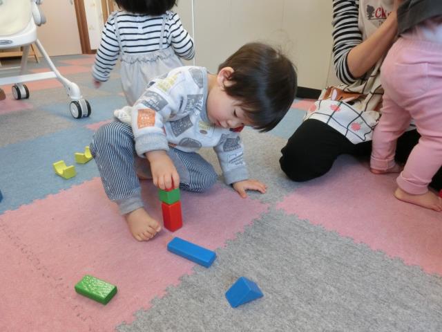 積んだり、並べたり、自分で考え工夫しながらしばらく集中して遊んでいました。