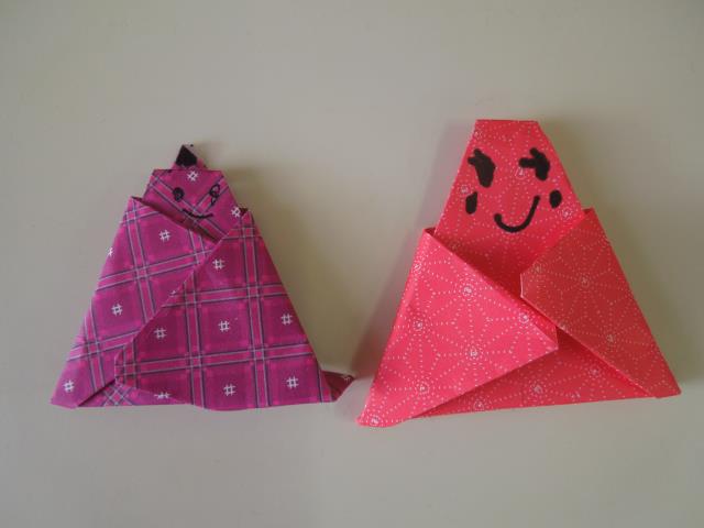 女の子が”おひな様”、男の子が”お内裏様”を千代紙で折りました。