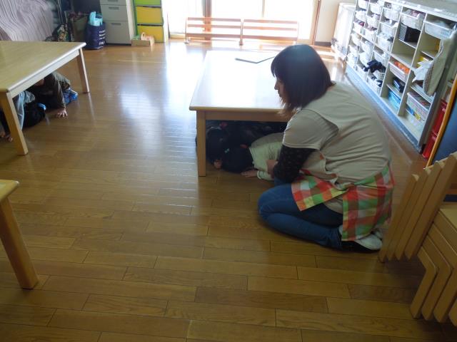 遊んでいる最中はテーブルが出ていないことが多く、上から物が落ちていないところを探して、そこへ避難しました。