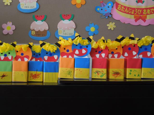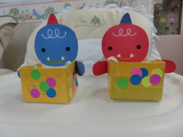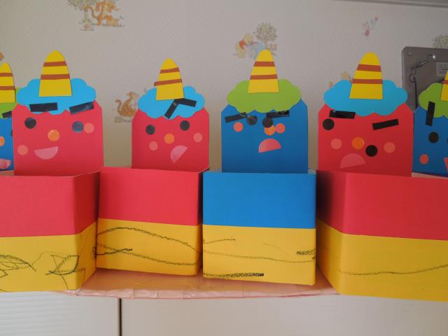 先日、保育参観日に途中まで作った ちゅうりっぷ組さんの豆まきの箱が出来上がりました。
