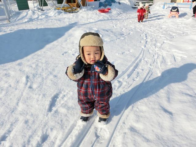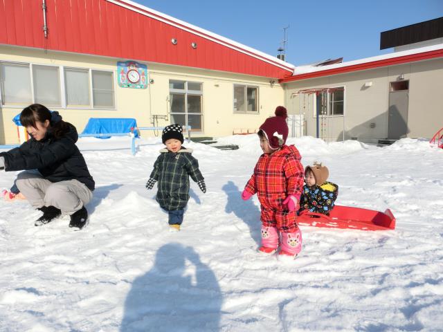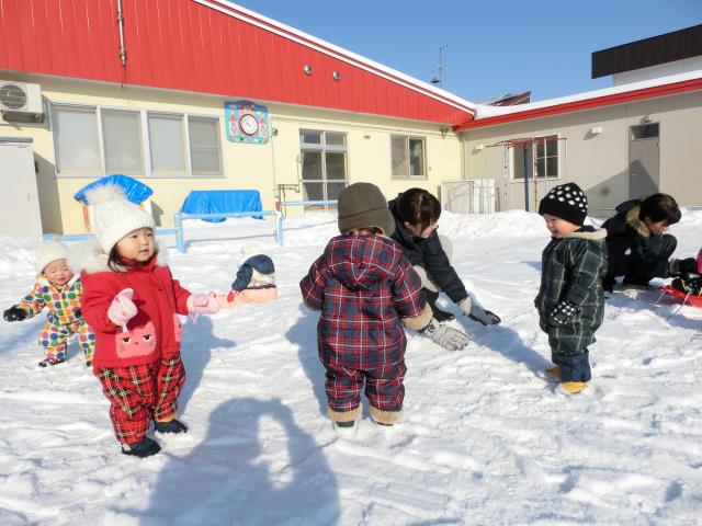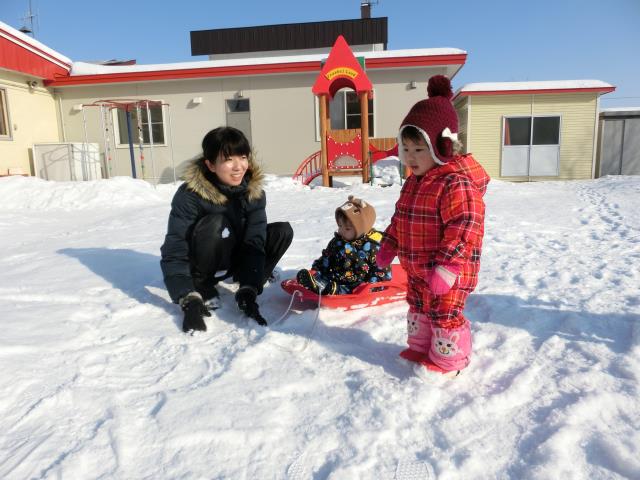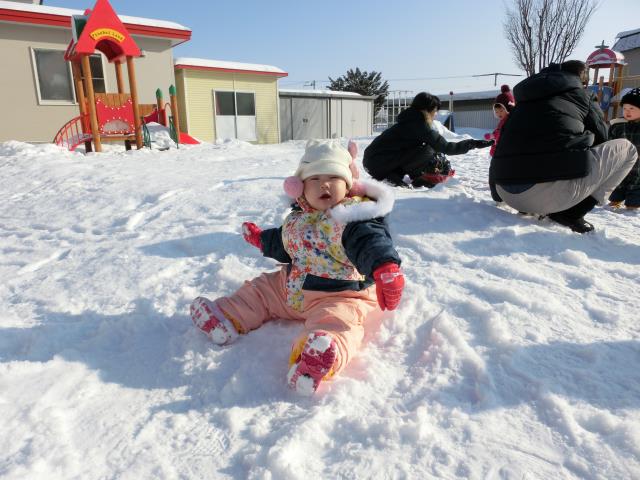 今シーズン、初めて雪遊びに参加できた3名も加わり、ソリに乗ったり、雪を触ったり♪