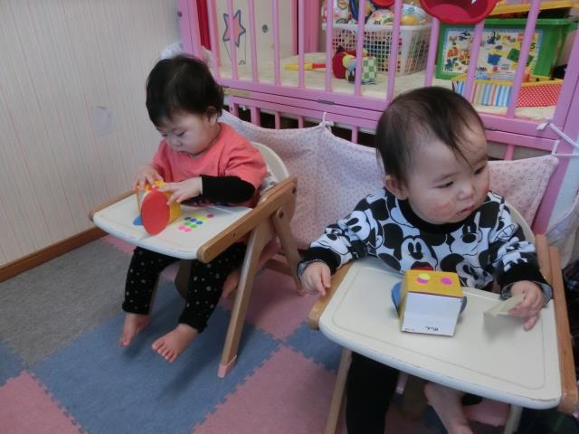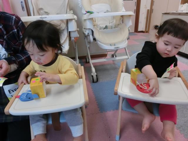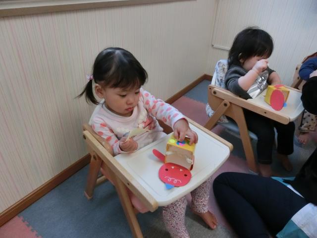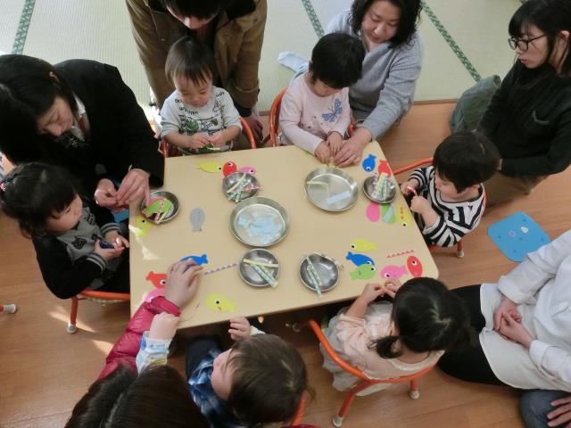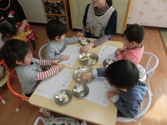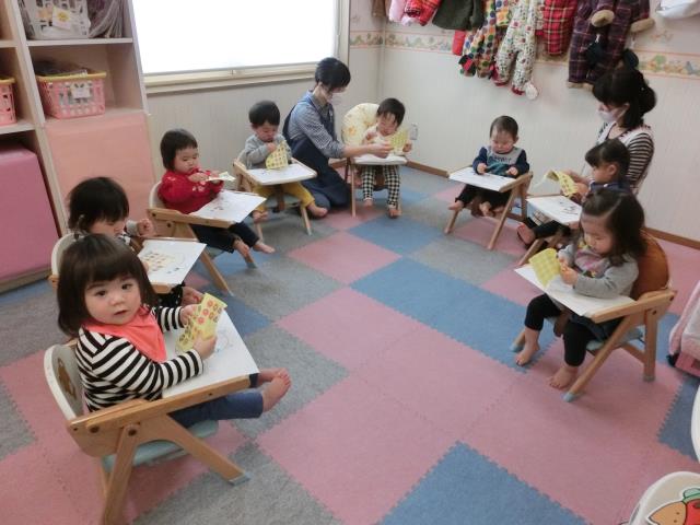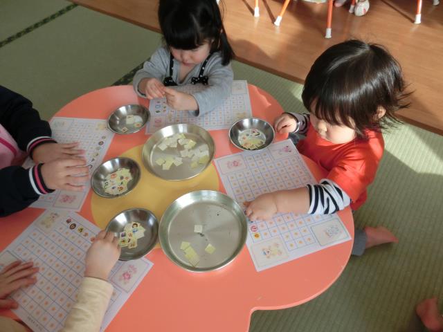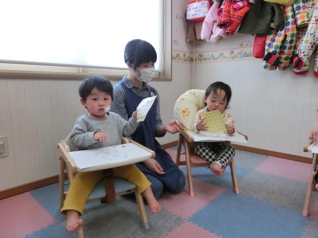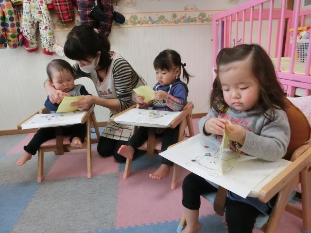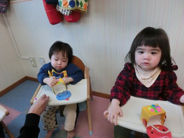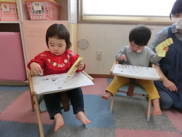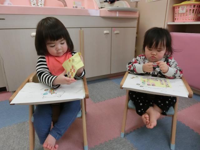 今日のひよこ組さんは、節分に向けて豆まき用の”赤ちゃん鬼のマス”にシールを貼って模様をつけています。