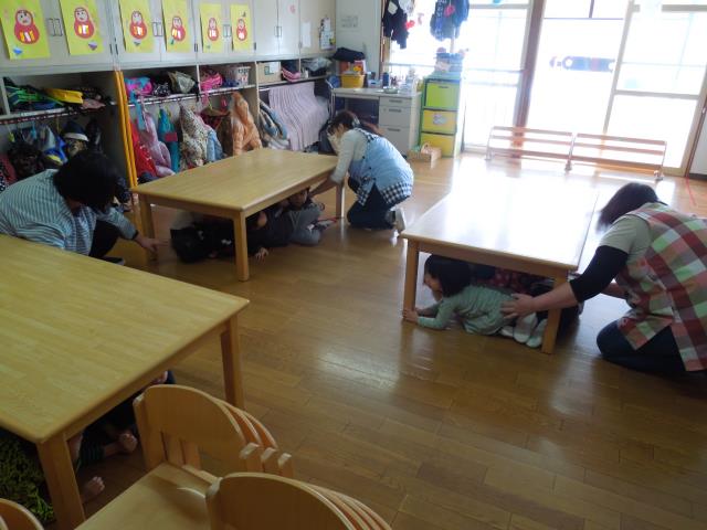 昨日 地震があったので、みんな真剣に説明を聞き、ベルが鳴ったら机の下へ。