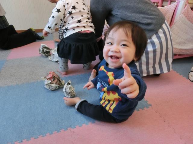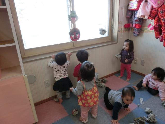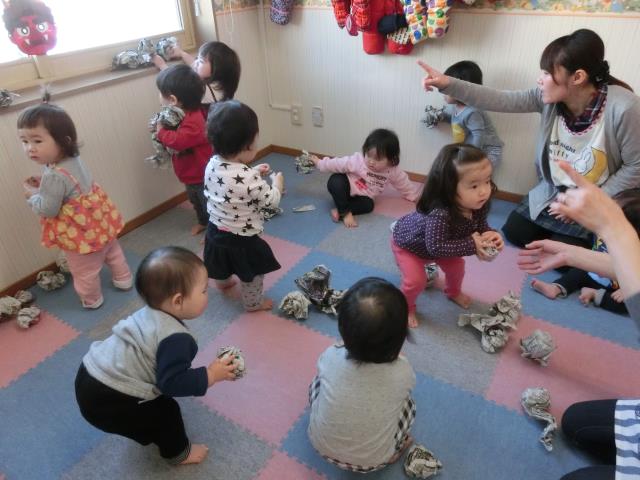 明日の節分に向けて、鬼のお面めがけて丸めた新聞紙を投げて、練習をしました。