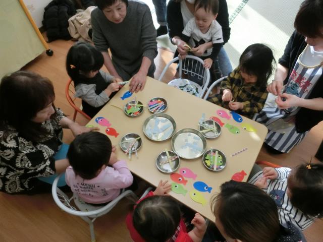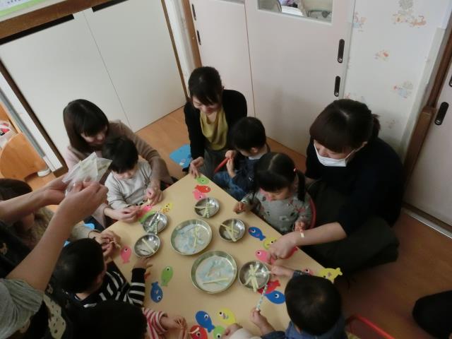 つくし組さんは、ペタペタとシールを貼ってお魚作り。