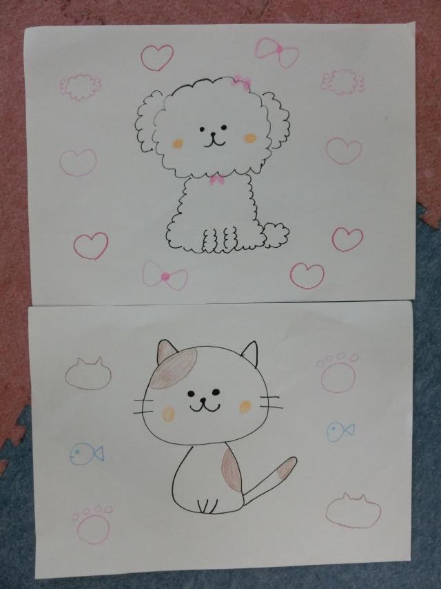 ワンちゃん・ネコちゃんの絵が描いてある台紙に、シールを貼って楽しみました。
