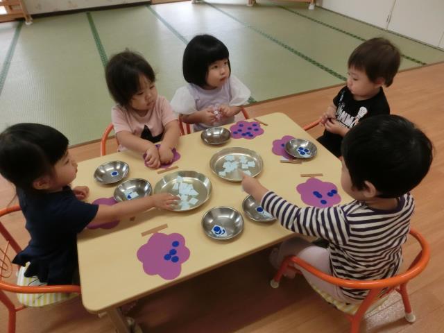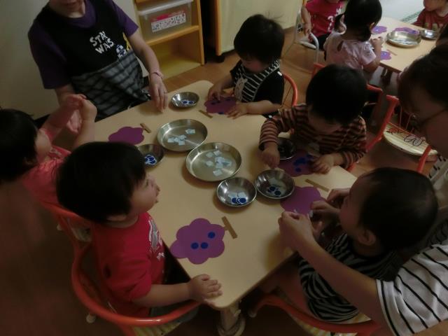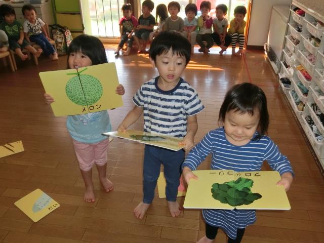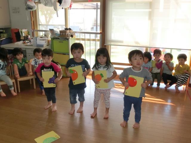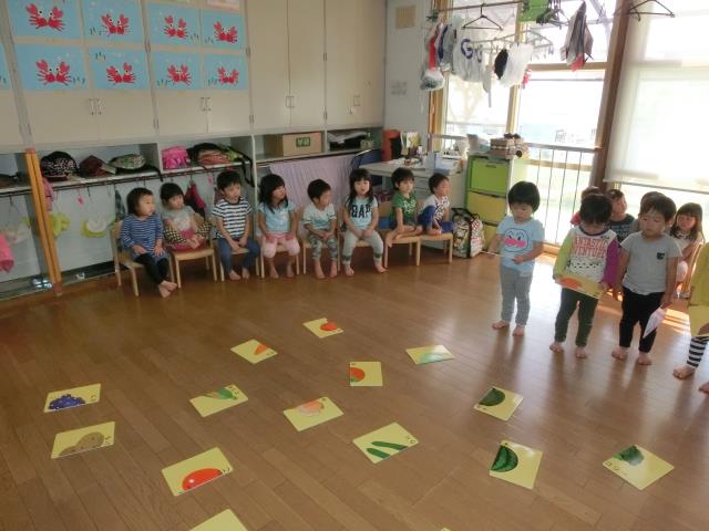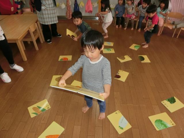 たんぽぽさんは、野菜や果物の絵合わせカードをして遊びました。