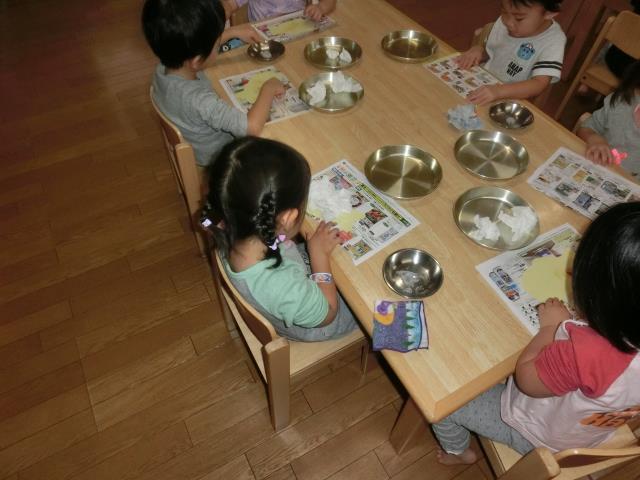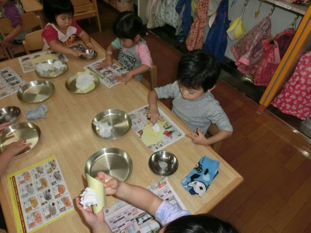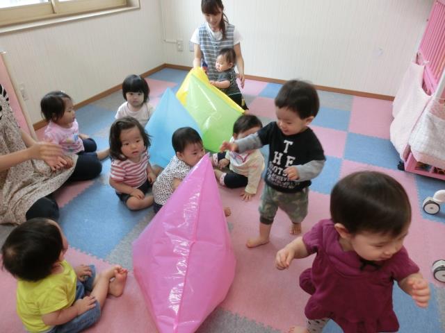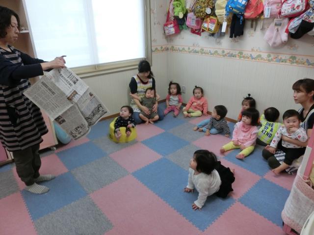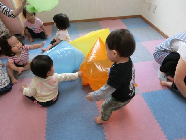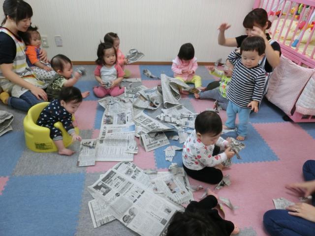 ビニール袋の風船を追いかけたり、新聞紙をちぎったり、丸めて投げたり、たくさん体を動かして遊んでいます。