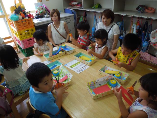 先生の説明を聞いて、上手にハサミを使って″輪つなぎ”をしたり、画用紙に絵を描いて″飛行機”を作っていました。