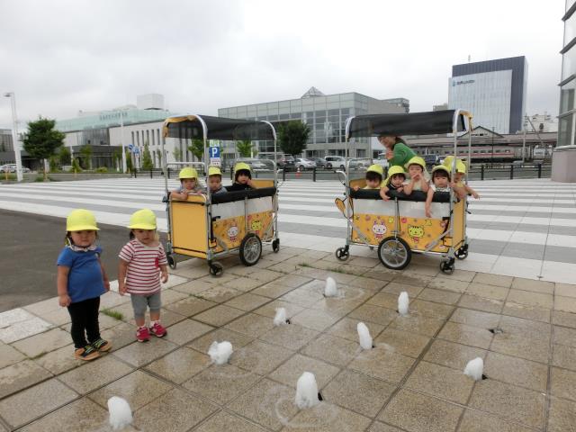 すべり台に乗って楽しんだり、噴水のお水に触れて涼んだりしてきました。