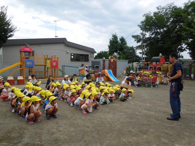 園庭に逃げたみんなは、園長先生と消防の方のお話を聞いてしっかりお約束です。