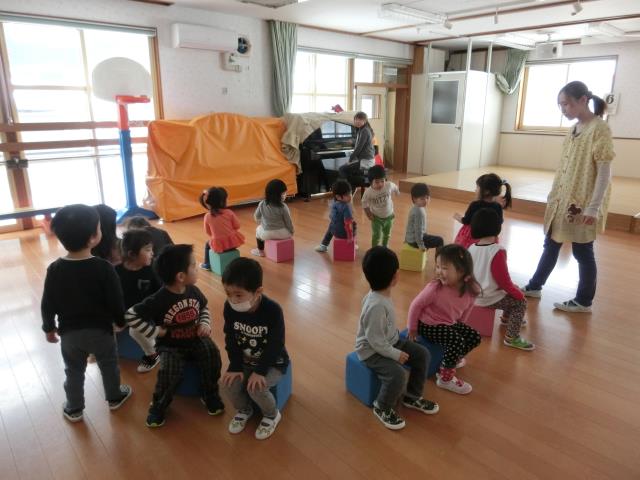 ピアノに合わせて歩くこと、素早く座ることを楽しみながら、みんなで盛り上がりました。