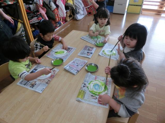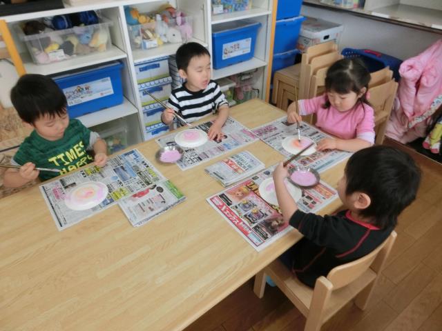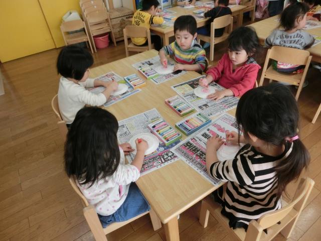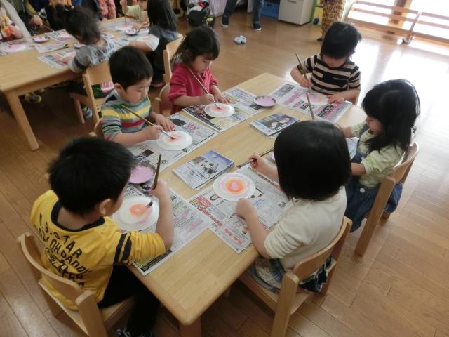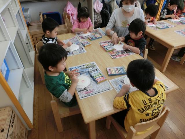 紙皿にクレヨンで模様を描き、上から絵の具を塗った『はじき絵』で着物の部分を作りました。時間はかかりましたが、楽しみながら取り組めました。