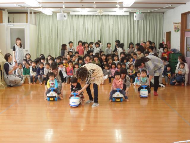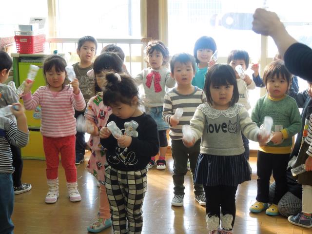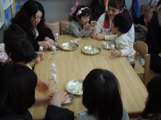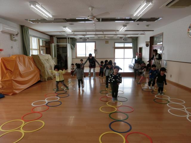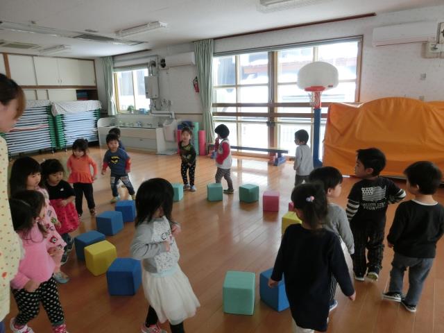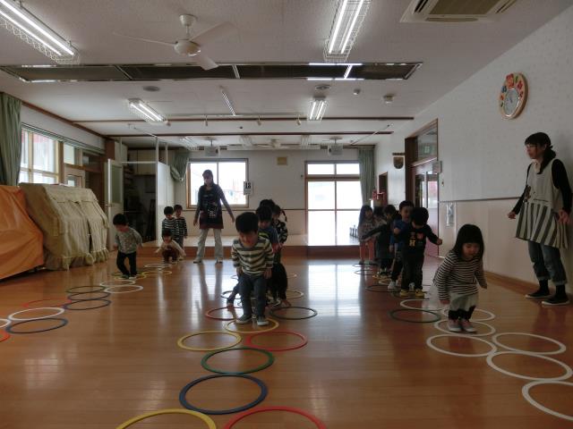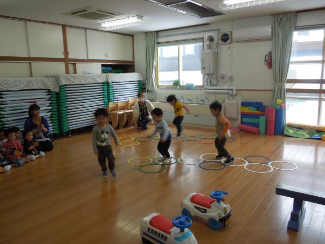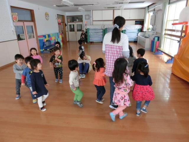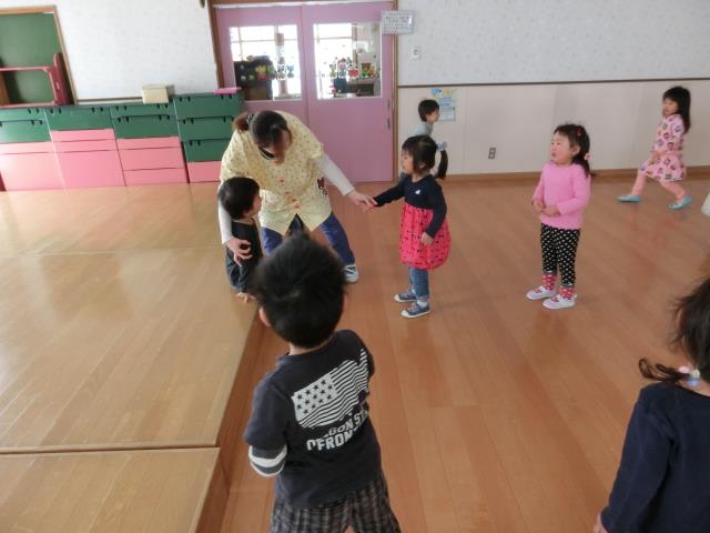 3つのグループに分かれて歌いながら手をつないで回り「後ろの正面だあれ」で、名前を呼ばれた子はとても嬉しそうでした。