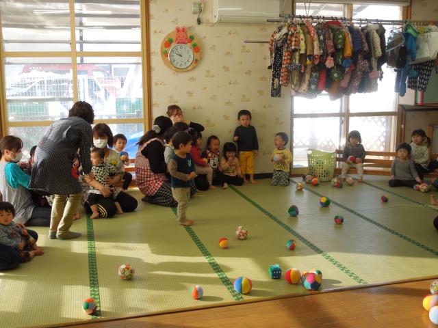 0,1歳児は つくしの部屋に集まり豆の代わりのボールを持って準備はOK!
