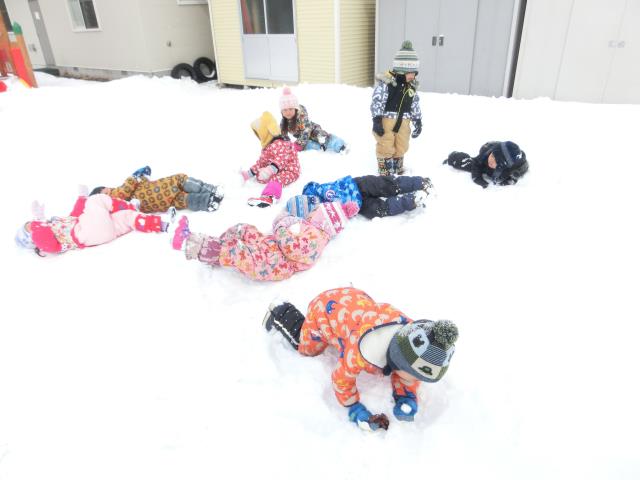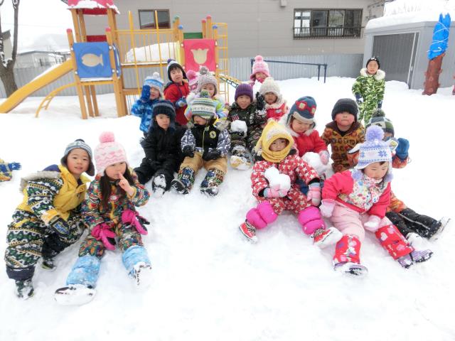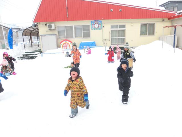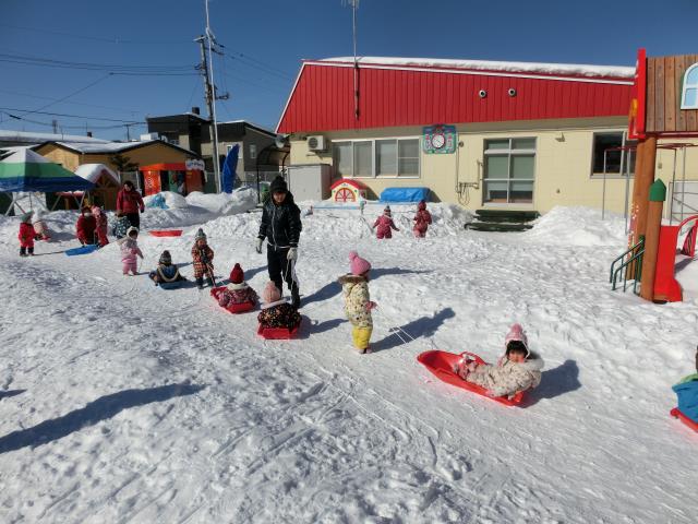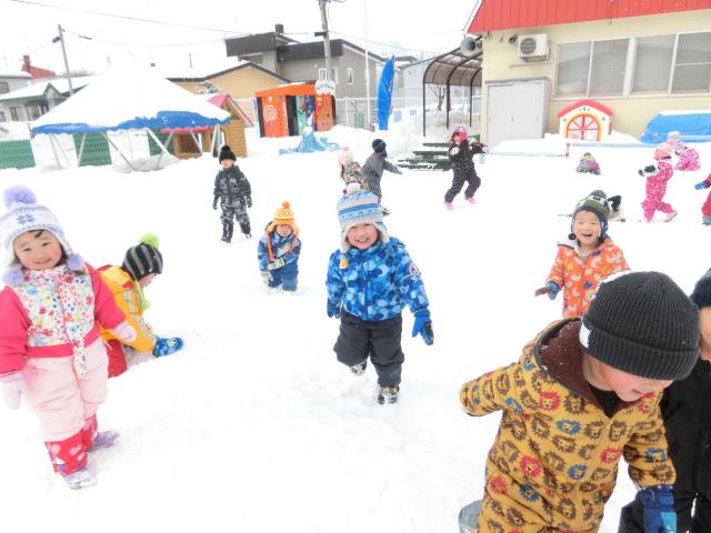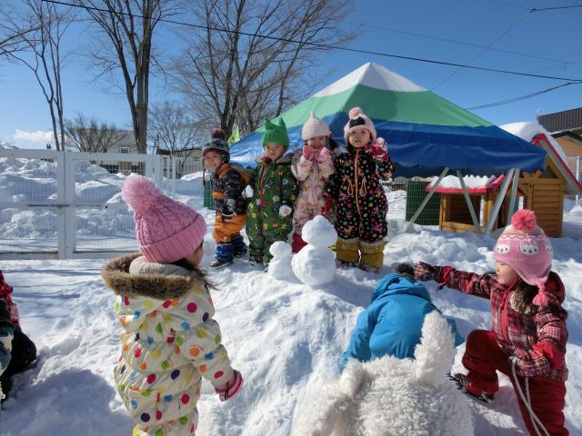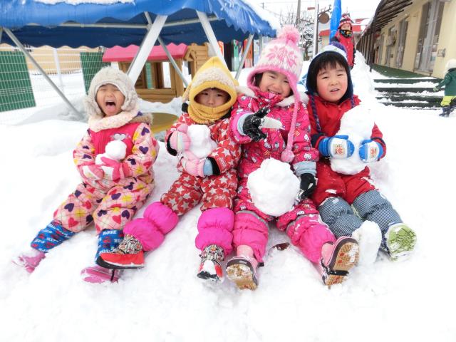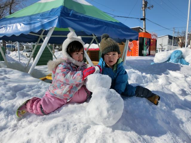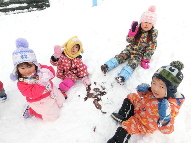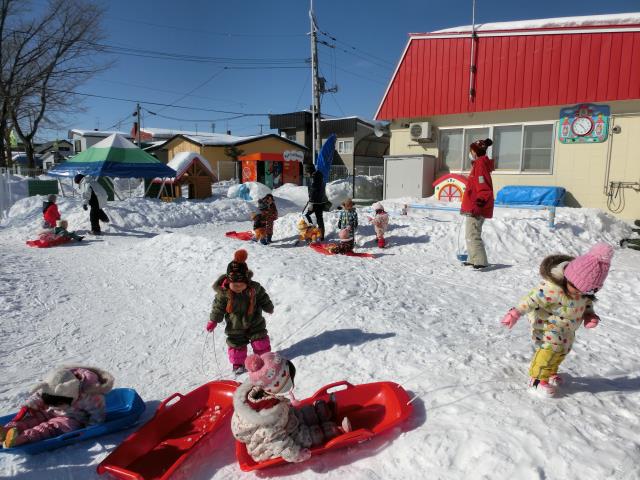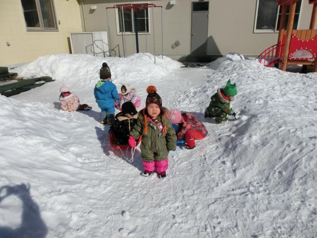 お友達を乗せてソリを力いっぱい引っ張ったり、小さな雪だるまを作ったりと、たくさん雪に触れて遊びました。