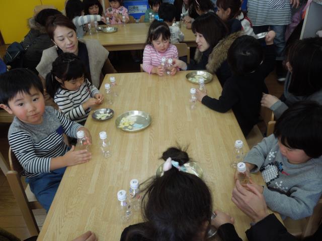 シールを貼って、ビーズを入れて出来上がった後は、みんなで鳴らしながら歌を歌いました。