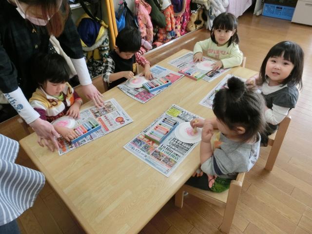 3歳ちゅうりっぷ組さんは、折り紙制作で〝にわとり”と〝羽子板”を折りました。