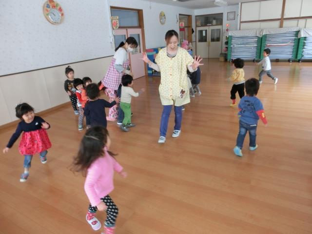 歌に合わせてオオカミ役の先生の周りを歩き、最後に「さあ、人間を食べに出かけよう!」とオオカミが捕まえに来る〝おおかみさん”と言う遊びでは、笑顔で逃げ回る子や、怖くて泣いてしまう子も…。