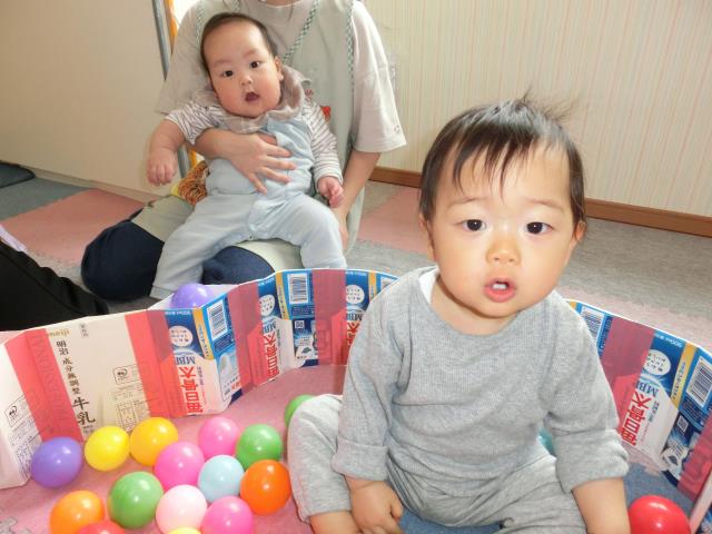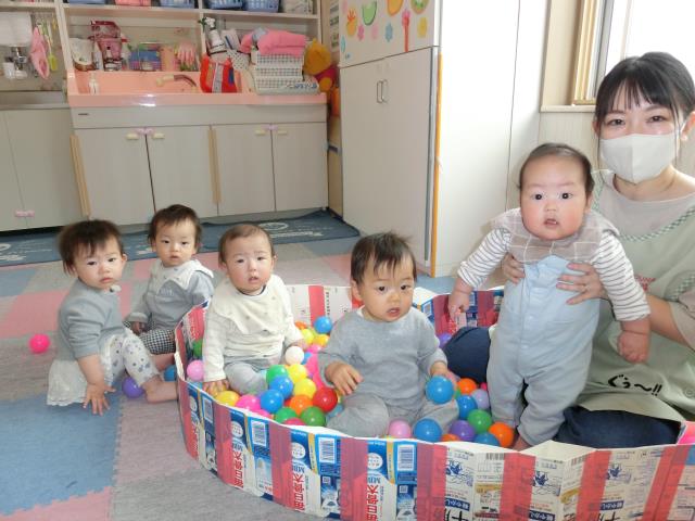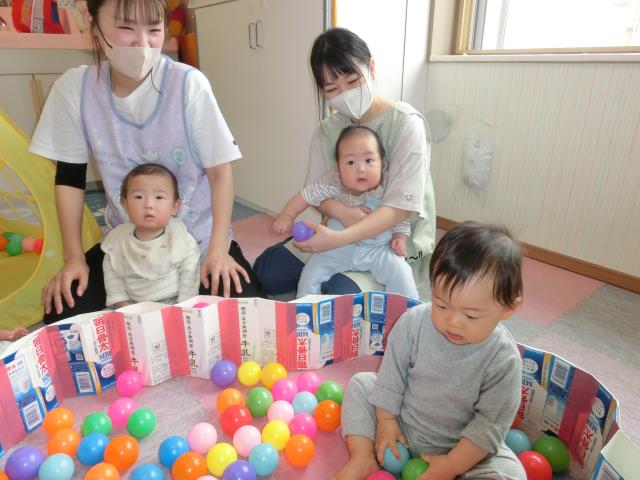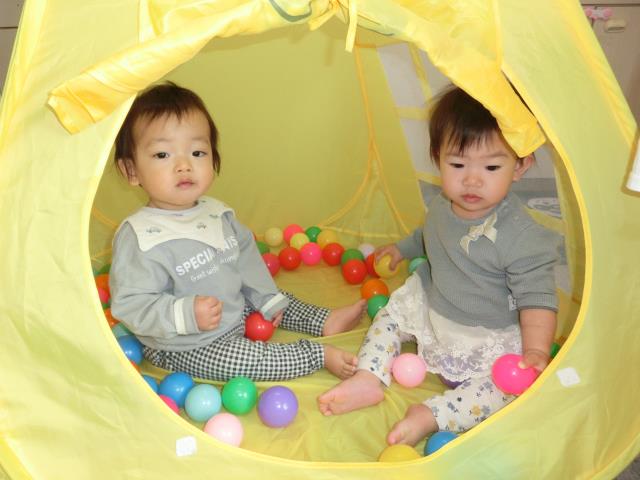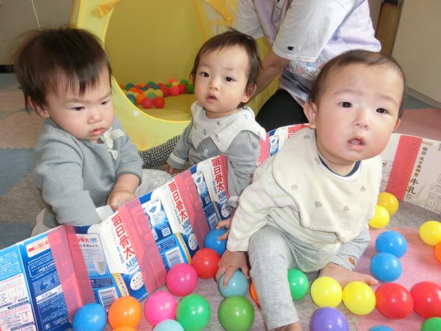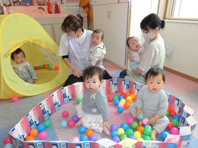 今日のひよこぐみは、お部屋でボールプール・ボールハウスで遊びました。