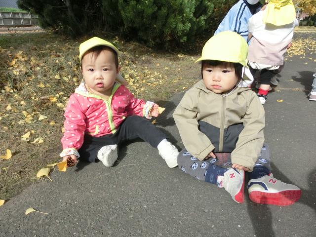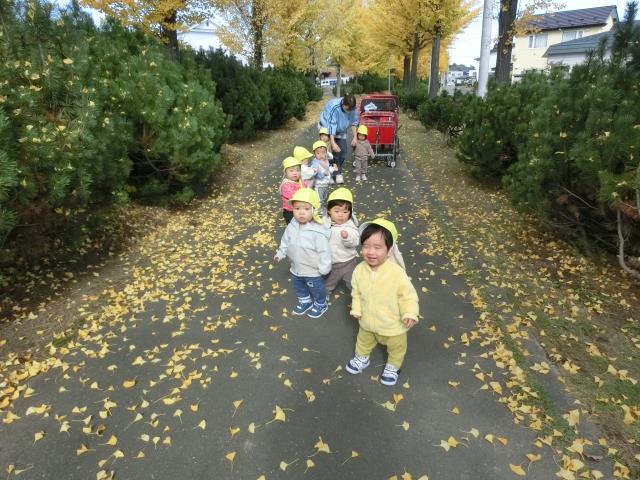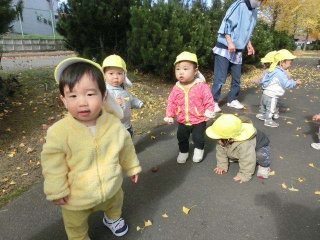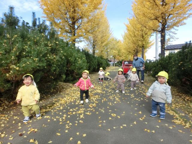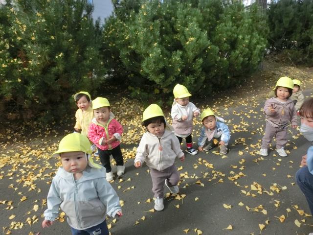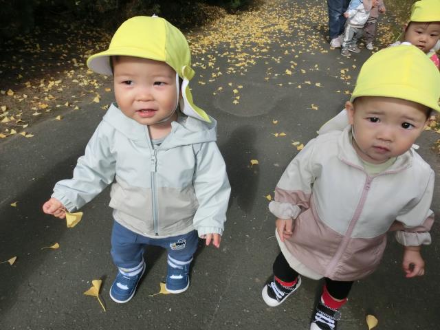 落ち葉を拾ってイチョウの葉を両手に持ちながら、嬉しそうに歩いていたひよこぐみさんでした。