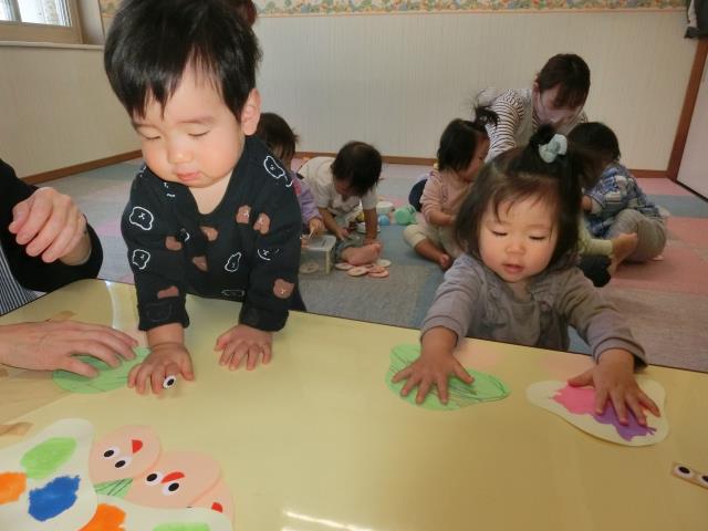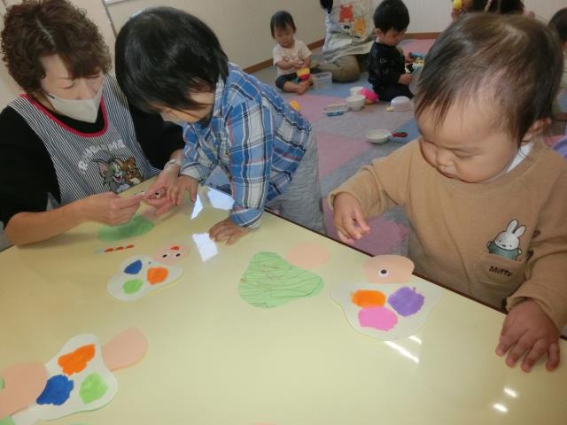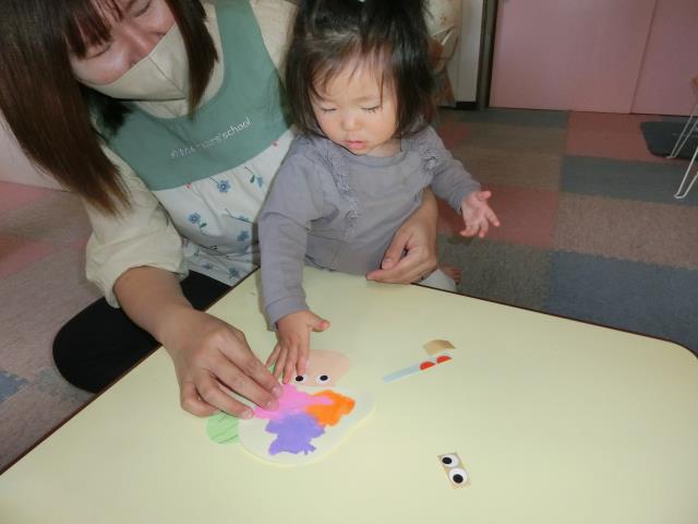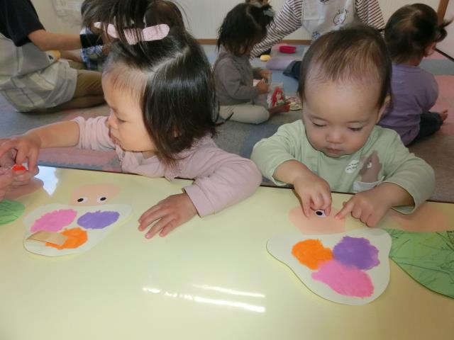 シールを台紙から剥がして貼ったり、先生と一緒に行い好きな所へ貼り、楽しんで取り組めていましたよ!