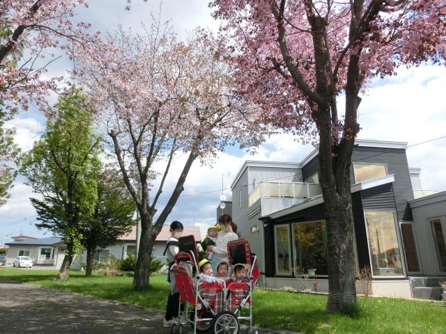 風が吹くと桜の花びらがひらひらと落ちてきて、手を伸ばしたり目で追いかけて興味を示していた子ども達です。