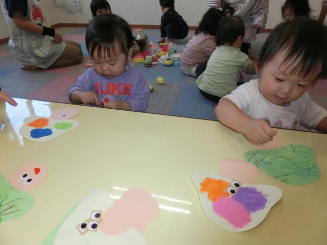 今日のひよこぐみは、9月製作の続きを行い、みんなが作った2つのきのこの顔に目と口のパーツのシールを貼りました。