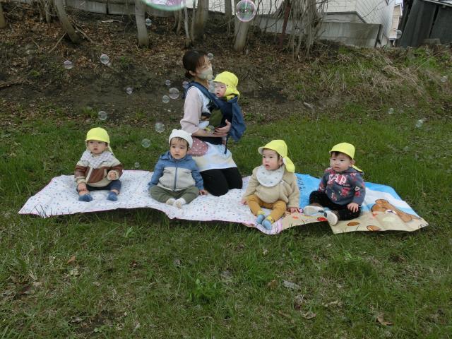 遊歩道ではレジャーシートに座って草に手を伸ばしたり、しゃぼん玉を目で追って声を出して楽しみました。