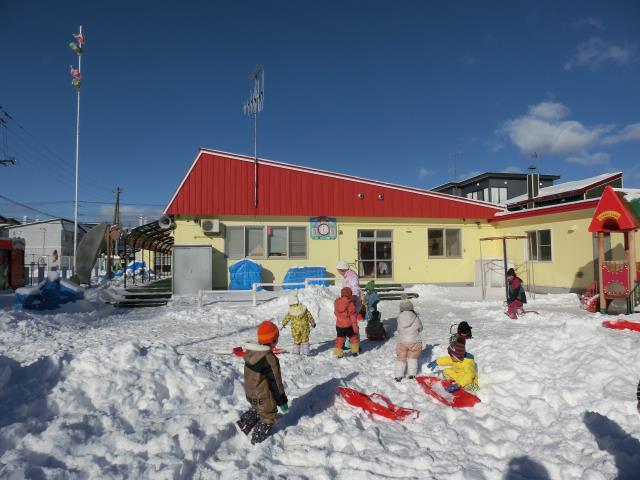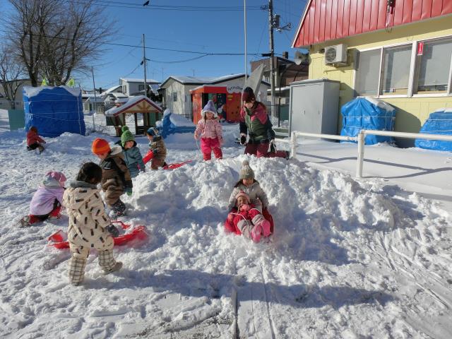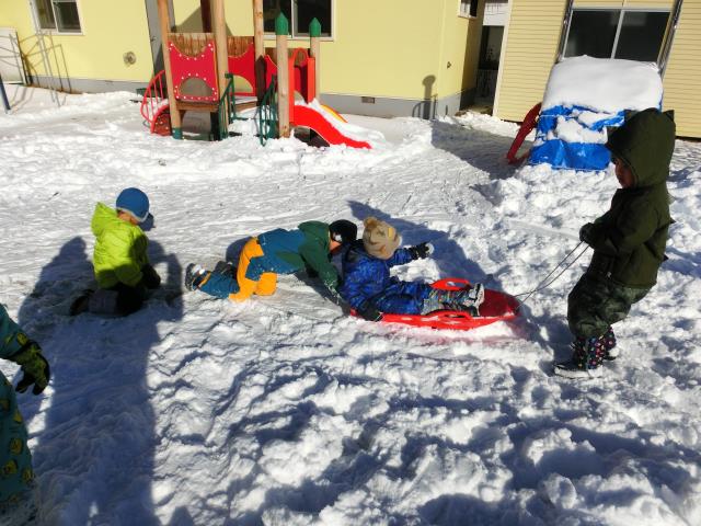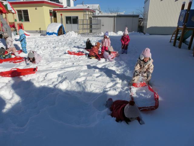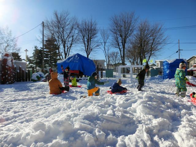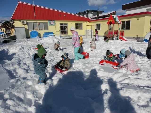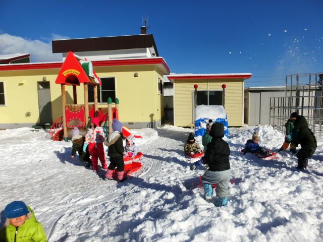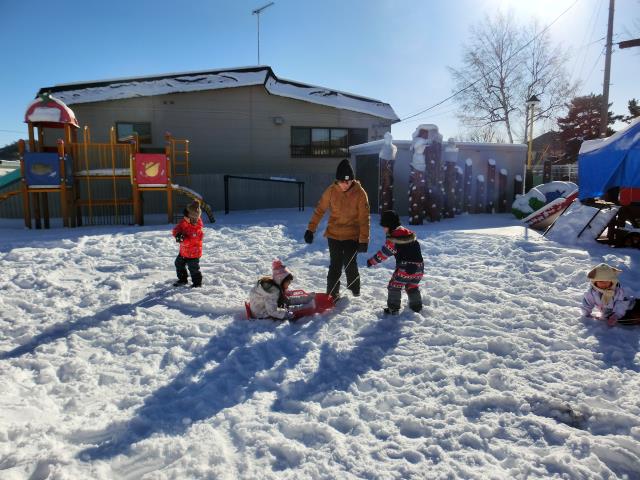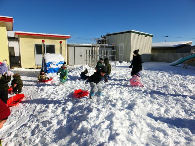 ソリを引っ張り合ったり、小さなお山からのソリ滑りを楽しんだりと、思い思いに楽しむ様子が見られましたよ!