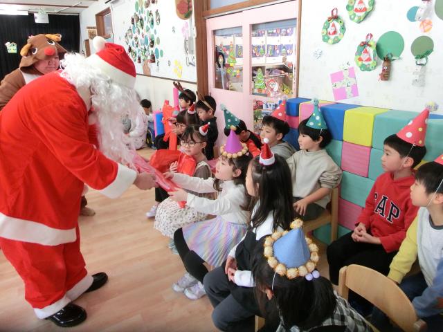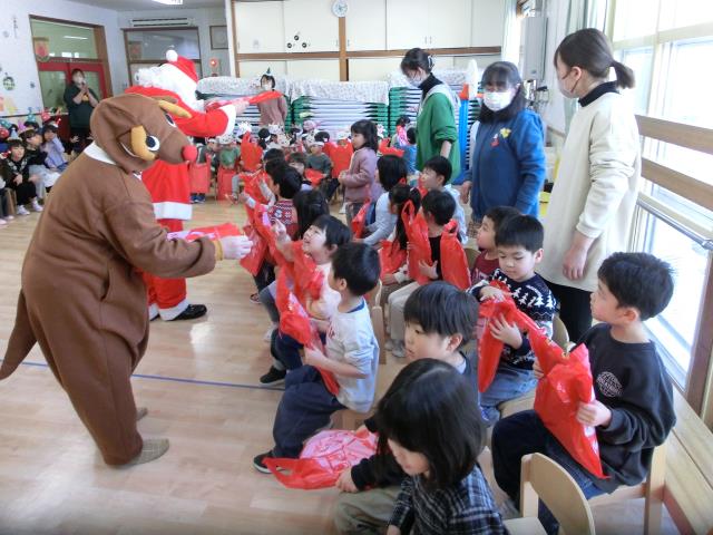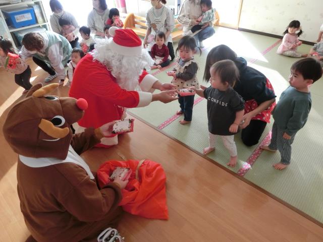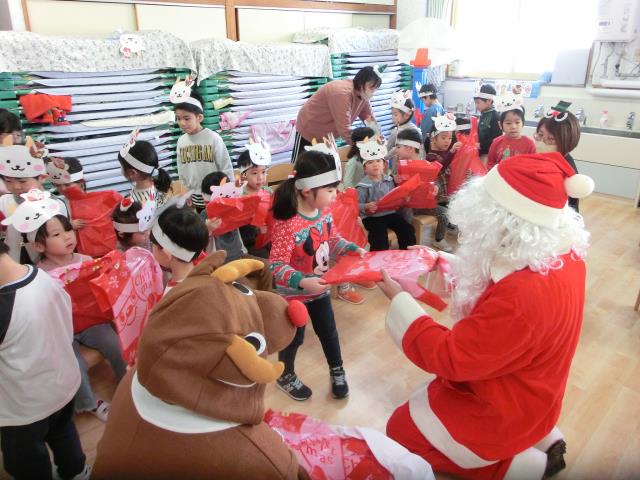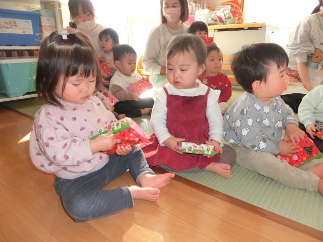始めはビックリしていた子ども達でしたが、プレゼントはしっかりと受け取り、中を覗いたりして喜んでいましたよ。