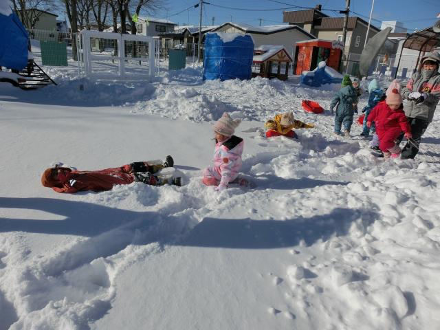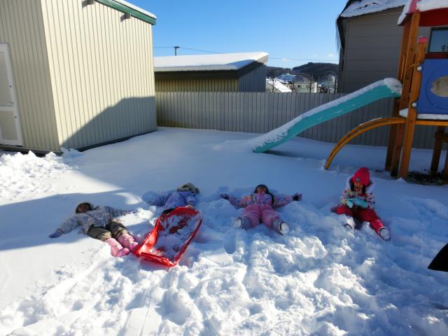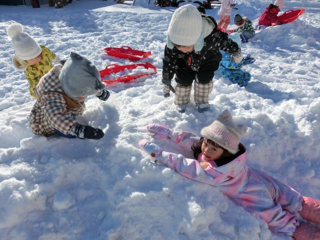 ソリで引っ張りあったり、雪合戦をしたり、雪の上に寝そべったり。
