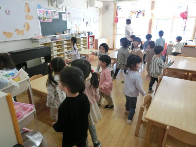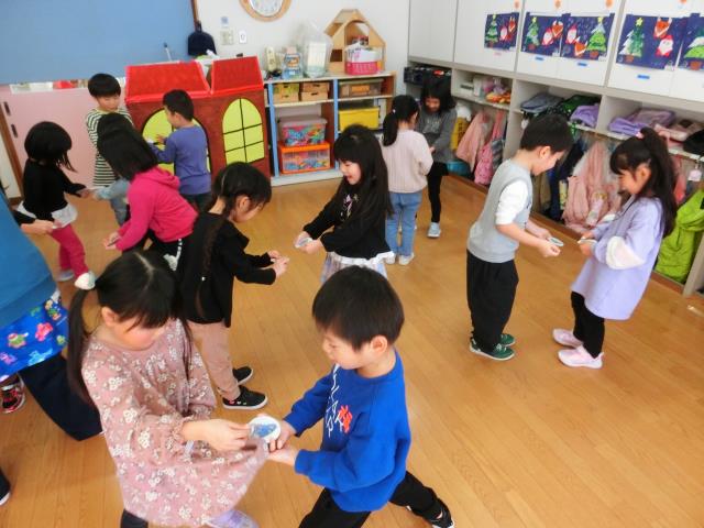 歌を歌いながら、同じ絵を持っているお友だちを見つけるゲーム。